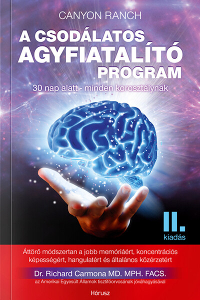 30 nap alatt minden korosztálynak Áttörő módszertan a jobb memóriáért, koncentrációs képességért, hangulatért és általános közérzetért Dr. Richard Carmona MD. MPH. FACS. - az Amerikai Egyesült Államok tisztifőorvosának jóváhagyásával „Fantasztikus, hogy az emberek napjainkban akár már 90 évig is élhetnek, de sajnálatos, hogy sok ember túléli a saját agyát” - mondja Dr. Richard Carmona, az Amerikai Egyesült Államok korábbi tisztifőorvosa. „Az emberi agy körülbelül 70 évig funkcionál rendesen, aztán a teljesítményünk rohamosan romlani kezd... hacsak nem teszünk ellene!” Dr. Richard Carmona Te adnál 30 napot az életedből azért, hogy aztán életed végéig az elméd a maximumon dolgozzon? Hogy ne kelljen félned az időskori elbutulástól, a memóriazavartól? Hogy az Alzheimer-kórt, és más betegségeket, amik tipikusan az idős korban alakulnak ki, megelőzd? Dr. Carmona egy egyedülálló stratégiát dolgozott ki, hogy mindenkinek segítsen fiatal maradni szellemileg, testileg és lelkileg. A Csodálatos Agyfiatalító Program - mely kategóriája bestsellere - azóta az egész világon ismertté vált, mindenkinek hathatós segítséget nyújt az öregedés és a demencia, sőt az Alzheimer-kór megelőzésében is. A program az arizonai Canyon Ranch-nek (az USA egyik legnagyobb wellness és egészségügyi intézményének) védjegye és egyedülálló szolgáltatása lett, melyet már számtalan hálás és gyógyult páciens kórtörténete is visszaigazolt. Dr. Carmona tanácsait betartva bizonyítottan javul az életminőségünk, nyugodtabb és kiegyensúlyozottabb gondolkodást érhetünk el, miközben az általános közérzetünk is kiváló lesz. A Csodálatos Agyfiatalító Program nem csak az időseknek nyújt hasznos tanácsokat, hanem a tanulástól megfáradt diákoknak, a munkától leterhelt dolgozóknak, tanároknak, irodai alkalmazottaknak, felső vezetőknek és mindenkinek, aki úgy érzi, hogy az agyának felfrissülésre van szüksége. A könyv fejezetei bemutatják agyunk működését és egészségét, a stressz káros és ártalmas hatásait, a méregtelenítés szerepét és fontosságát a hétköznapjainkban, valamint az alvás minőségének javítását is elérhetővé teszi mindenki számára. A táplálkozásról és a testmozgásról szóló fejezetek konkrét célokat és feladatokat is tartalmaznak. Nem csak üres frázisokat ismételgetnek (mely szerint „egyen több zöldséget és gyümölcsöt, hogy egészségesebb legyen”), hanem pontos listával segíti az olvasókat. Csupán 30 nap, és a Csodálatos Agyfiatalító Program jobbá teszi a jelenlegi mentális és fizikai állapotodat, így segít abban, hogy a jövő nyugdíjasaként is aktív szellemi életet élj!
