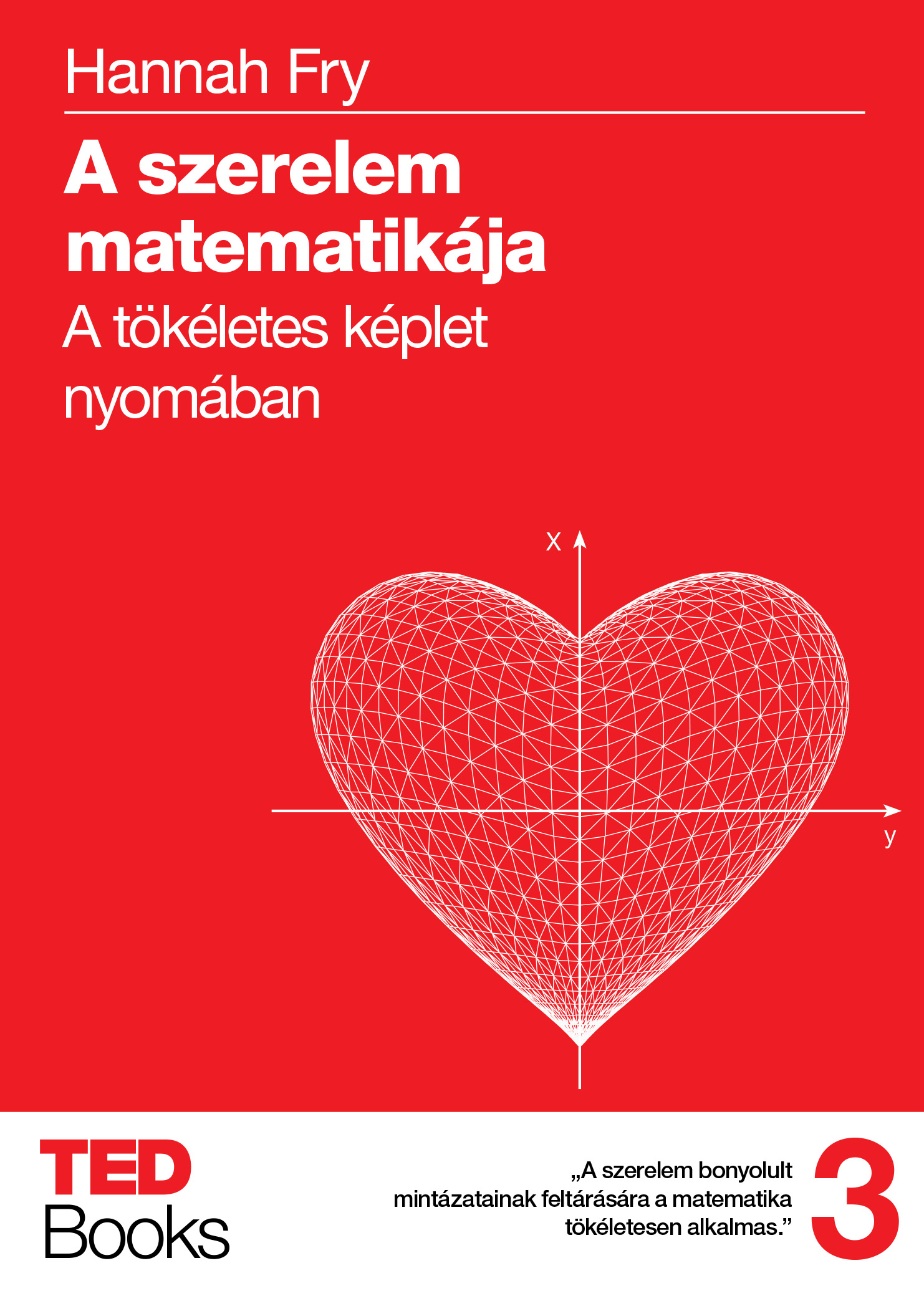 „Könyvemben egy eddig ismeretlen perspektívából, a matematika segítségével mutatom be az emberiséget leginkább foglalkoztató témát: a szerelmet.” Mennyi az esélyünk arra, hogy ránk talál a szerelem? Mekkora a valószínűsége, hogy tartós marad? Hogyan működik a netes társkeresés? Mikor kellene megállapodnunk? Hogyan kerülhetjük el a válást? Segíthet-e eldönteni a játékelmélet, felhívjuk-e a másikat egy randi után? Hannah Fry a maga bölcs, szellemes és humoros módján bebizonyítja, hogy a matematika meglepően hasznos eszköze lehet a szerelem bonyolult, gyakran érthetetlen és bosszantó, de annál érdekesebb természetének feltérképezéséhez.