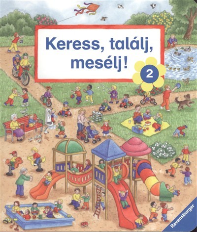 A második Keress, találj, mesélj! képeskönyv oldalai rengeteg keresni-, találni, és mesélnivalót rejtenek. Piac, óvoda, építkezés, orvosi rendelő, strand, állatkert, bevásárlóközpont, vasútállomás - mind-mind izgalmas, felfedezésre váró helyek az apróságok számára.