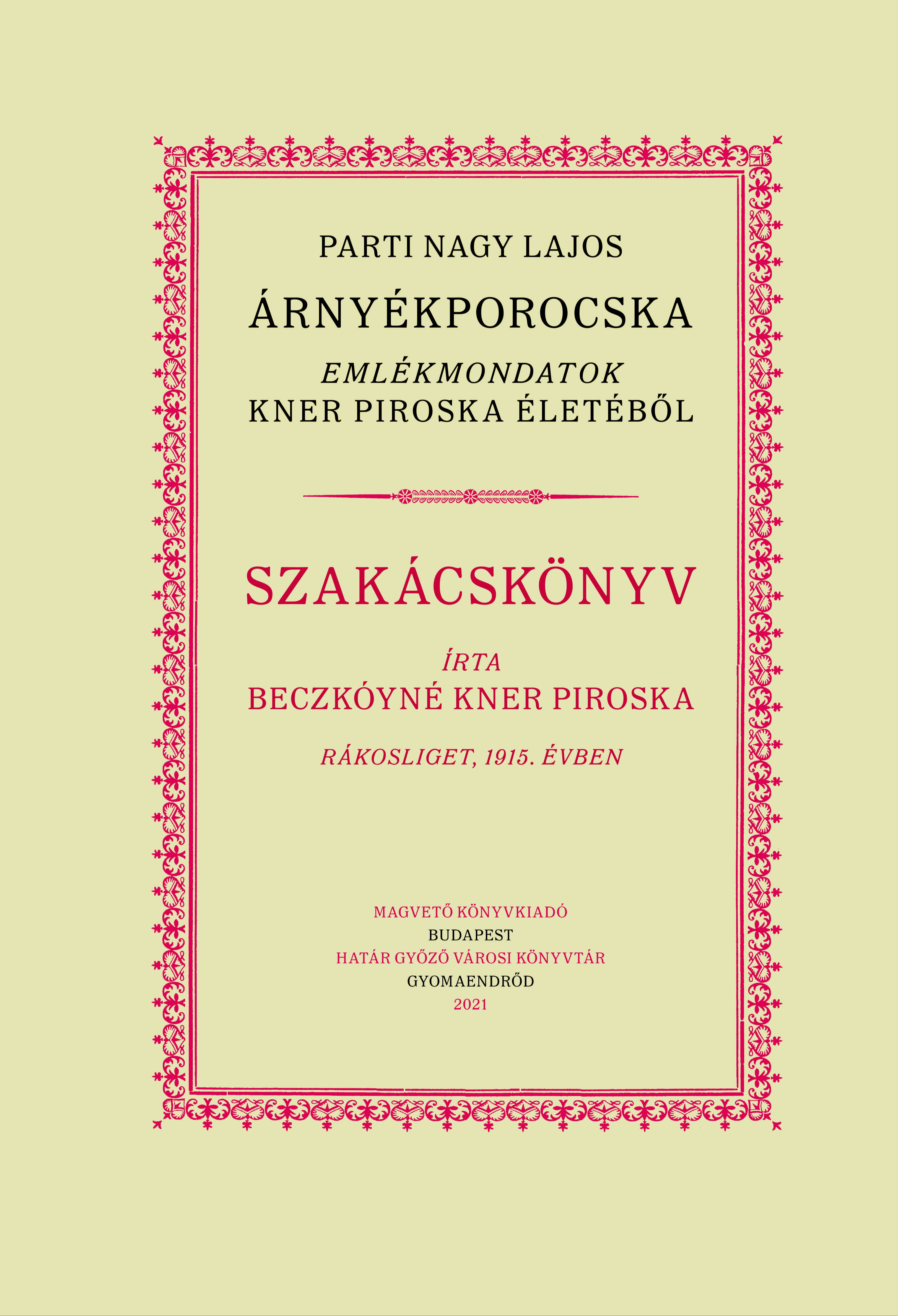Kner Piroska a Gyomai Kner Nyomda alapítójának, Kner Izidornak volt a legfiatalabb húga. 1877-ben született Gyomán, élete nagyobb részében háziasszonyként élt Rákosligeten. 1915-ben, a kor divatjának megfelelően, ő is írt egy szakácskönyvet, ám hiába remélte, hogy a családi kiadónál megjelenik, valahogy mindig hátrébb sorolódott az ő könyve. Az első világháború és az azt követő válságos időszak aztán végképp elsodorta, hisz addigra a spórolós szakácskönyvek ideje jött el. Kner Piroska kézirata a rákosligeti ház padlására került sok más holmival együtt, míg évtizedekkel később a ház új tulajdonosa ráakadt. A gyomai Határ Győző Városi Könyvtár és a Magvető közös vállalkozásában most végre megjelenik az annak idején gondosan összeállított szakácskönyv, amely ma is tökéletesen használható, a levesektől vezet végig a desszertekig és a befőzésig. Hogy „igazságot szolgáltassunk"" Kner Piroskának, Parti Nagy Lajos egy kísérő könyvben idézi meg élete fontosabb mozzanatait a családi levelezés és más dokumentumok alapján. Az „emlékmondatok"" varázslatos bepillantást adnak az ismeretlenség homályából épp csak kiemelkedő nőalak és családja, a nagy múltú nyomdász- és művészdinasztia küzdelmes sorsába.A két könyvet Kner Antikva betűkből, Kozma Lajos díszítőelemeit felhasználva tervezte Pintér József, és a Gyomai Kner Nyomda nyomtatja, ahogy annak idején történhetett volna.