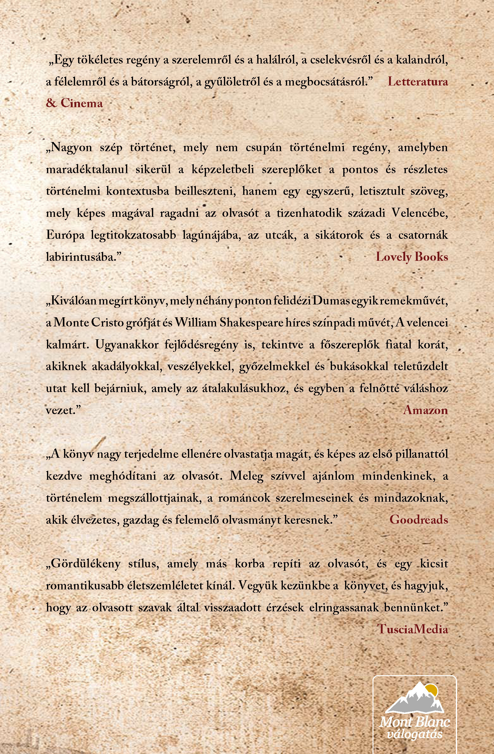 „Nagyon szép történet, mely nem csupán történelmi regény, amelyben maradéktalanul sikerül a képzeletbeli szereplőket a pontos és részletes történelmi kontextusba beilleszteni, hanem egy egyszerű, letisztult szöveg, mely képes az olvasót a 16. századi Velencébe magával ragadni, Európa legtitokzatosabb városába, az utcák, a sikátorok és a csatornák labirintusába.”